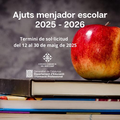 El Consell Comarcal del Baix Camp ha obert la convocatòria d'ajuts individuals de menjador per al curs escolar 2025-2026, amb la novetat que l’ens comarcal també gestionarà les beques de les famílies reusenques que fins al curs passat va gestionar l’Ajuntament de Reus.